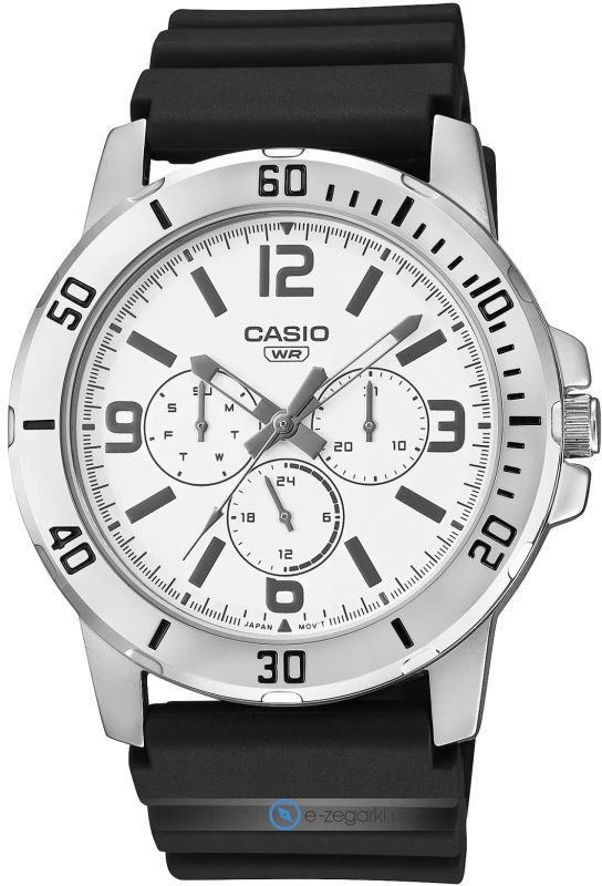 Zegarek MTP-VD300-7B zasilany jest za pomocą baterii kwarcowej. Pasek w odcieniach koloru czarnego zrobiony jest z wysokiej jakości tworzywa sztucznego.