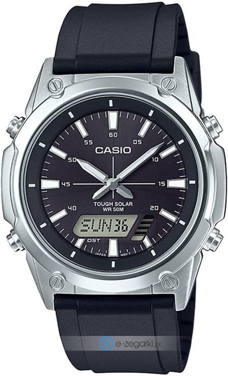 Zegarek AMW-S820-1A posiada mechanizm solarny zasilany dowolnym źródłem światła. Pasek jest w kolorze czarnym zrobiony jest z wysokiej jakości tworzywa sztucznego.