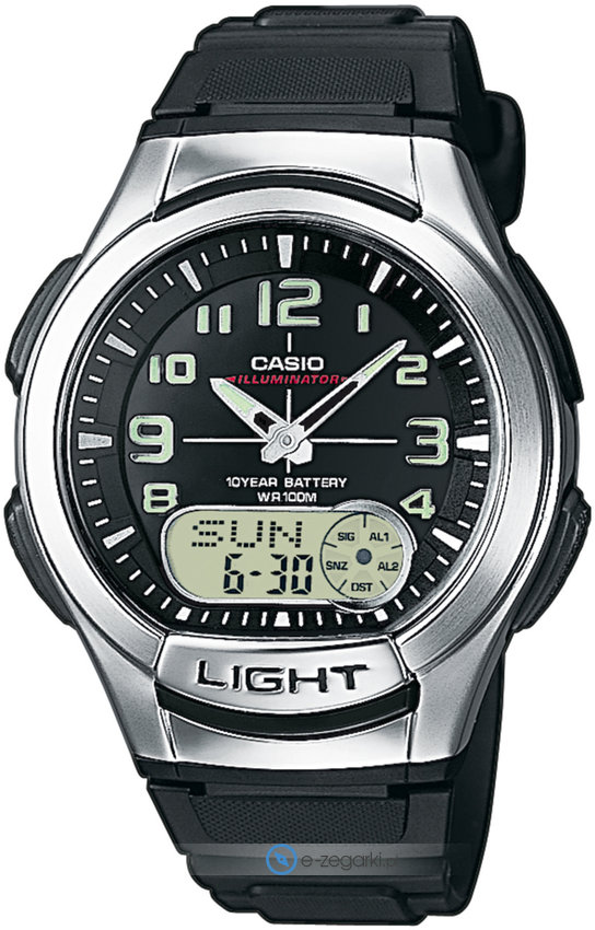 Model męski AQ-180W-1BV marki Casio należy do rodziny Casio Standard Combo. Charakterystyczny wygląd zegarka osiągnięto również dzięki tarczy w kolorze czarnym. Aktualna godzina zaprezentowana jest w sposób analogowo - cyfrowy co intuicyjnie pozwala ją odczytać. Koperta w barwach koloru srebrnego szeroka jest na 41 mm oraz ma grubość 15 mm - posiada okrągły kształt.