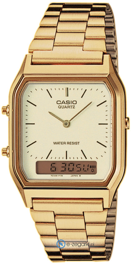 Zasilanie zegarka AQ-230GA-9DMQYES to standardowa bateria kwarcowa. Wytrzymała bransoleta w tonacji koloru złotego wytworzona ze stali nierdzewnej zapewnia wysoką jakość i trwałość.