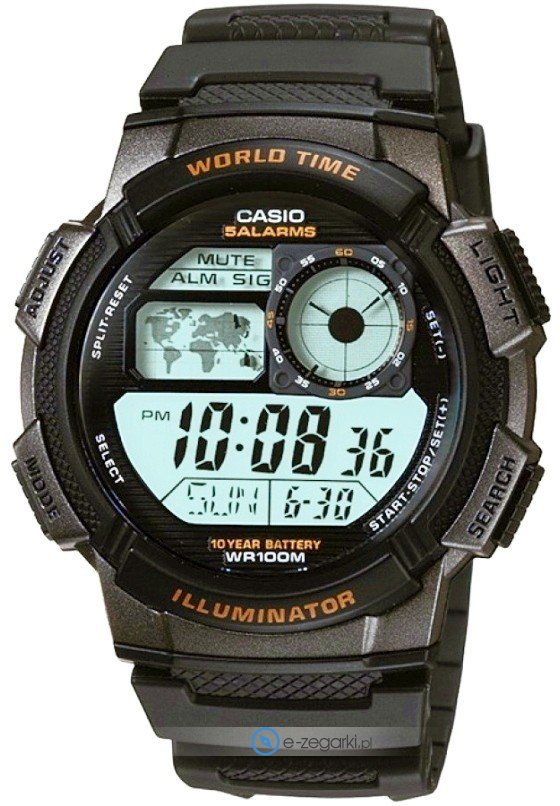 Zegarek AE-1000W-1A posiada kwarcowy mechanizm zasilany standardową baterią. Pasek czarnego koloru zrobiony jest z wysokiej jakości tworzywa sztucznego.