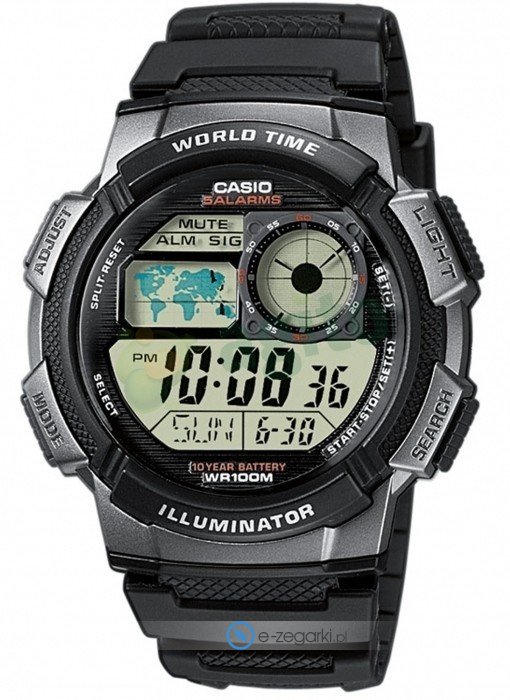 Zasilanie zegarka AE-1000W-1B to klasyczna bateria kwarcowa. Pasek czarnego koloru wykonany jest z wysokiej jakości tworzywa sztucznego.