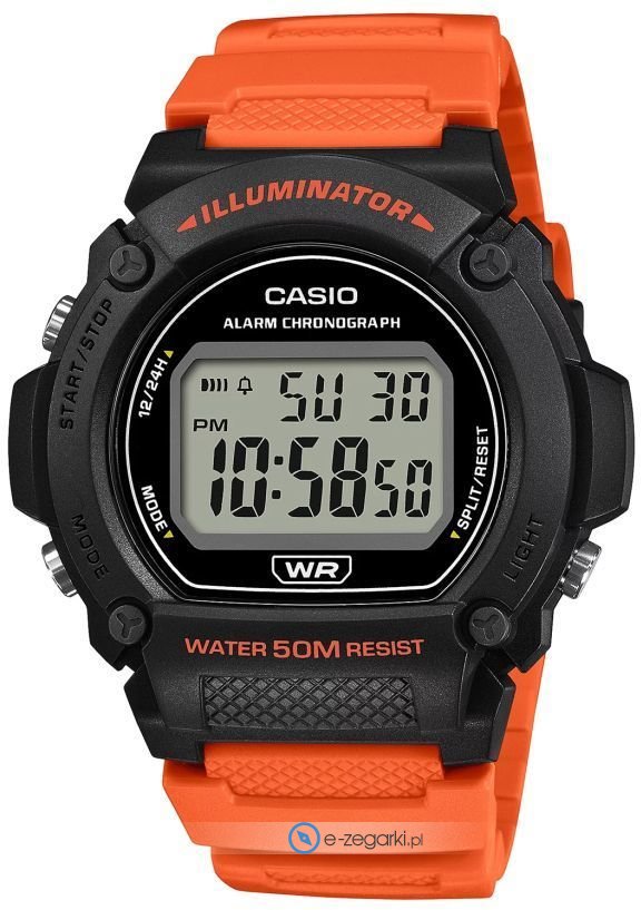 Zegarek W-219H-4AV posiada kwarcowy mechanizm zasilany tradycyjną baterią. Pasek w odcieniach koloru pomarańczowego wykonany jest z wysokiej jakości tworzywa sztucznego.