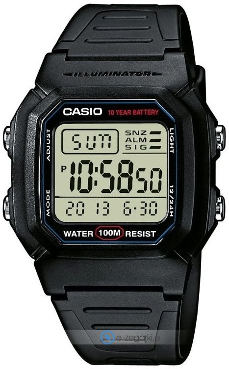 Zegarek W-800H-1AVEF marki Casio to gustowny zegarek naręczny męski, który wyposażono w ciekawe rozwiązania i funkcje. Model ten jest z serii Casio Standard Digital. Atrakcyjny wygląd zegarka osiągnięto m.in. poprzez cyferblat w kolorze czarnym. Zegarek ten pokazuje godzinę w formacie cyfrowym dzięki czemu odczyt jest intuicyjny. Koperta została pokryta kolorem czarnym szeroka jest na 36 mm oraz ma grubość 13 mm - w kształcie prostokątnym.