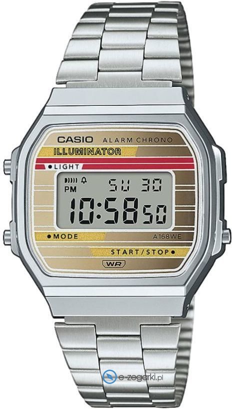 Męski zegarek A168WEHA-9AEF z kolekcji Casio Vintage marki Casio to połączenie smaku oraz oryginalnych funkcji. Wysokiej trwałości tarczę zegarka pokryto złotym kolorem. Zaprezentowana metodą cyfrową aktualna godzina jest czytelna i łatwa do sprawdzenia. Koperta jest w kolorze srebrnym szeroka jest na 35 mm oraz ma grubość 9 mm.