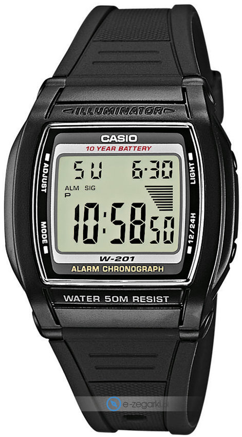 Zegarek W-201-1AV posiada kwarcowy mechanizm zasilany standardową baterią. Pasek w odcieniach koloru czarnego zrobiony jest z wysokiej jakości tworzywa sztucznego.