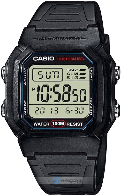 Zegarek W-800H-1AV posiada kwarcowy mechanizm zasilany standardową baterią. Pasek czarnego koloru zrobiony jest z wysokiej jakości tworzywa sztucznego.