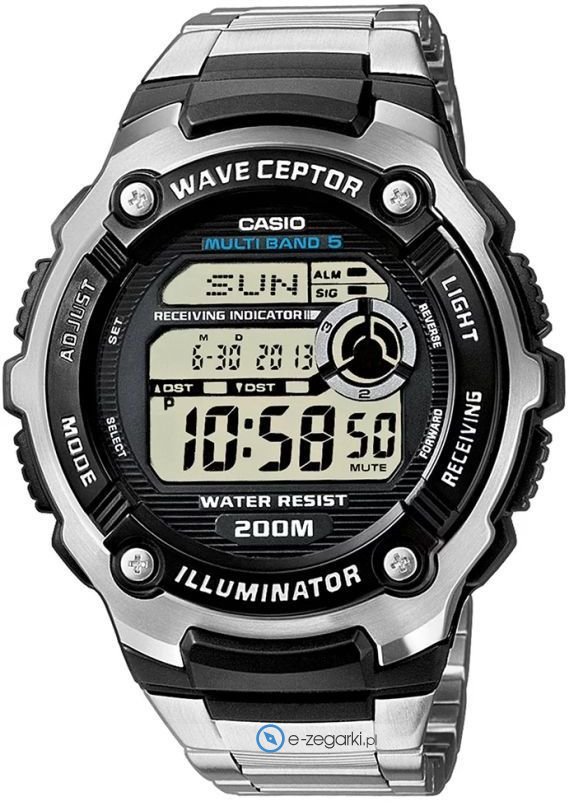 Model męski WV-200RD-1AEF z serii Casio Waveceptor marki Casio. Godzina pokazywana jest w sposób cyfrowy co bez trudu pozwala ją odczytać. Koperta szeroka jest na 47 mm oraz ma grubość 15 mm - posiada okrągły kształt.