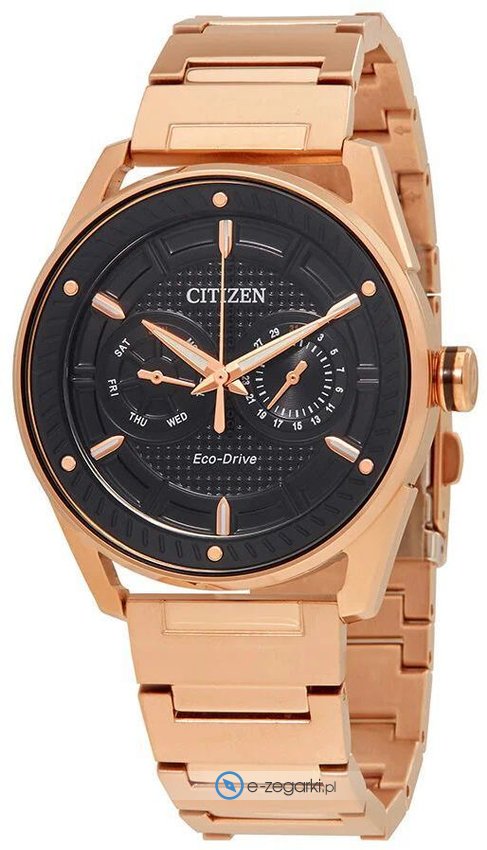 Zegarek męski BU4023-54E marki Citizen to idealne połączenie funkcjonalności i modnego wzornictwa. Charakterystyczny wygląd zegarka osiągnięto również dzięki tarczy w kolorze czarnym. Aktualna godzina prezentowana jest w sposób analogowy co bez trudu pozwala ją odczytać. Koperta w odcieniach koloru różowo złotego szeroka jest na 42 mm - ma okrągły kształt.