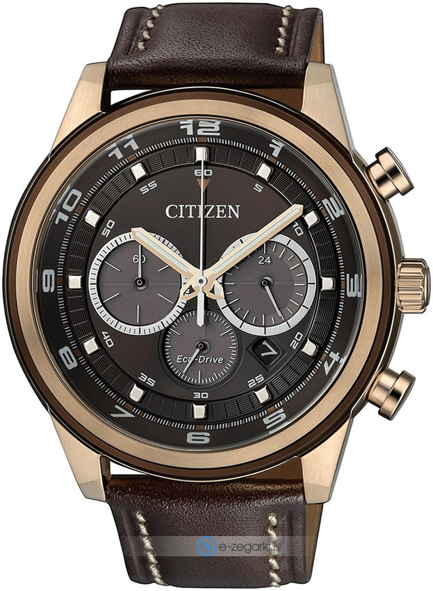 Zegarek męski CA4037-01W marki Citizen to dobre połączenie funkcjonalności oraz modnego wzornictwa. Model ten w gamie innych zegarków tego producenta występuje w serii Citizen Chrono. Stylu nadaje wysokiej klasy tarcza w kolorze brązowym. Zaprezentowana metodą analogową aktualna godzina jest czytelna i szybka do sprawdzenia. Koperta w odcieniach koloru złotego szeroka jest na 44 mm oraz ma grubość 12 mm - posiada okrągły kształt.