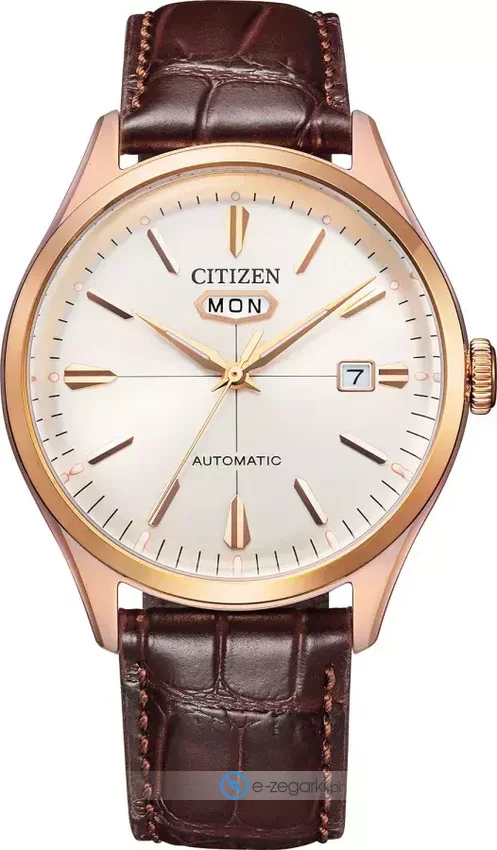 Męski zegarek NH8393-05AC z kolekcji Citizen Mechanical marki Citizen to połączenie stylu i nieprzeciętnych funkcji. Niestereotypowy wygląd czasomierza osiągnięto również dzięki tarczy w kolorze białym. Godzina pokazywana jest w sposób analogowy co niezmiernie łatwo pozwala ją odczytać. Koperta jest ozdobiona kolorem różowo złotym szeroka jest na 40 mm oraz ma grubość 13 mm - w kształcie okrągłym.