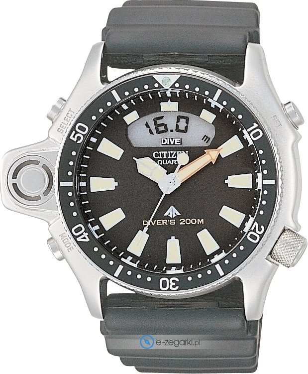 Zegarek męski JP2000-08E z kolekcji Citizen Promaster marki Citizen. Stylu dodaje wysokiej klasy tarcza w kolorze czarnym. Pokazana metodą analogowo - cyfrową aktualna godzina jest czytelna i łatwa do sprawdzenia. Koperta została ozdobiona kolorem stalowym szeroka jest na 44 mm oraz ma grubość 17 mm - charakteryzuje się okrągłym kształtem.