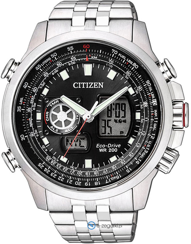 Model męski JZ1060-50E marki Citizen z kolekcji Citizen Promaster. Stylu dodaje wysokiej jakości cyferblat w kolorze czarnym. Pokazana metodą analogowo - cyfrową bieżąca godzina jest czytelna i prosta do odczytania. Koperta w odcieniach koloru stalowego szeroka jest na 50 mm oraz ma grubość 13 mm - ma okrągły kształt.