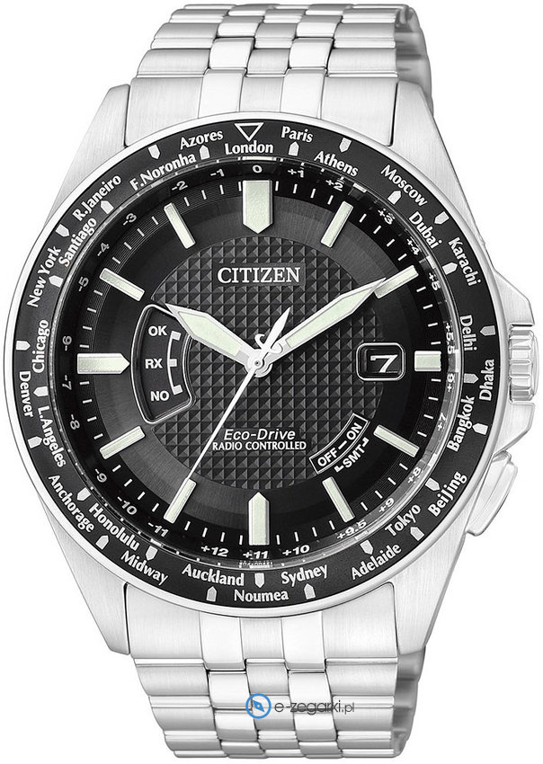Męski zegarek CB0021-57E z serii Citizen Radio Controlled marki Citizen to połączenie estetyki oraz oryginalnych funkcji. Niebanalny wygląd czasomierza osiągnięto także dzięki tarczy w kolorze czarnym. Aktualna godzina prezentowana jest w sposób analogowy co intuicyjnie pozwala ją odczytać. Koperta jest w kolorze czarnym szeroka jest na 43 mm oraz ma grubość 10 mm - w kształcie okrągłym.