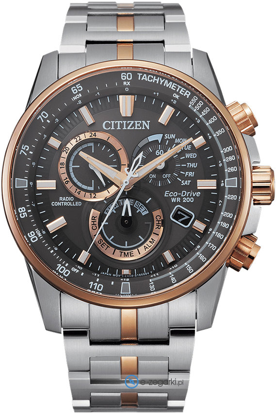 Męski zegarek CB5886-58H z serii Citizen Radio Controlled marki Citizen to połączenie stylu oraz nowatorskich mechanizmów. Niebanalną budowę zegarka uzyskano dzięki tarczy w kolorze czarnym. Godzina zaprezentowana jest w sposób analogowy co intuicyjnie pozwala ją odczytać. Koperta jest w kolorze różowo złotym szeroka jest na 43 mm oraz ma grubość 13 mm - w kształcie okrągłym.
