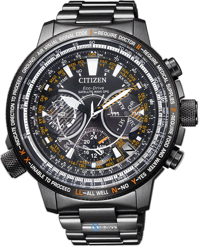 Zegarek męski CC7015-55E marki Citizen należy do rodziny Citizen Satellite Wave. Charakteru nadaje wysokiej jakości cyferblat w kolorze czarnym. Godzina zaprezentowana jest w sposób analogowy co niezmiernie łatwo pozwala ją odczytać. Koperta w barwach koloru stalowego szeroka jest na 47 mm oraz ma grubość 15 mm - posiada okrągły kształt.