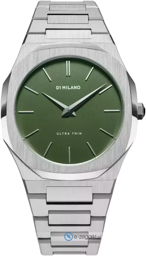 Model UTBJ06 marki D1 Milano to elegancki zegarek naręczny męski, który wyposażono w pomysłowe rozwiązania oraz funkcje. Wysokiej trwałości cyferblat zegarka ozdobiono zielonym kolorem. Zaprezentowana metodą analogową bieżąca godzina jest czytelna i szybka do sprawdzenia. Koperta jest w kolorze srebrnym szeroka jest na 40 mm oraz ma grubość 6 mm.
