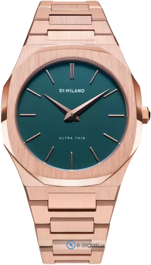 Zegarek męski UTBU02 marki D1 Milano to stylowe połączenie funkcjonalności a także modnego wzornictwa. Stylu nadaje wysokiej jakości cyferblat w kolorze zielonym. Pokazana metodą analogową aktualna godzina jest czytelna i szybka do odczytania. Koperta w odcieniach koloru różowo złotego szeroka jest na 38 mm oraz ma grubość 6 mm - wyróżnia się okrągłym kształtem.