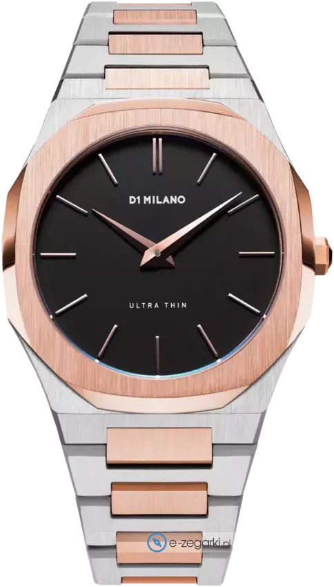 Model UTBU03 marki D1 Milano to stylowy zegarek naręczny męski, który wyposażono w pomysłowe rozwiązania oraz funkcje. Cyferblat zegarka jest w kolorze czarnym. Aktualna godzina przedstawiona jest w sposób analogowy co bez trudu pozwala ją odczytać. Koperta w odcieniach koloru srebrnego szeroka jest na 38 mm oraz ma grubość 6 mm.