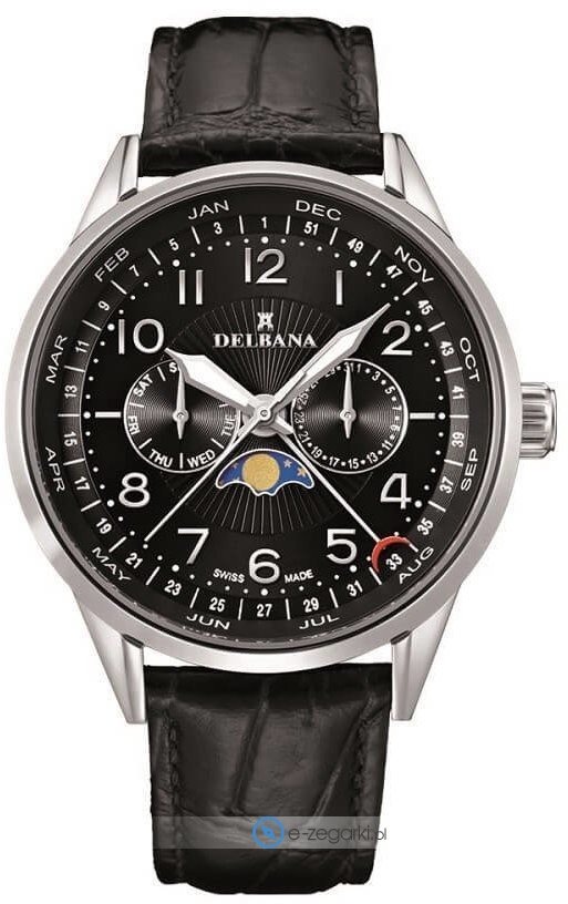 Model męski 41601.646.6.034 należy do rodziny Delbana Retro Moonphase marki Delbana. Atrakcyjny wygląd zegarka uzyskano również dzięki tarczy w kolorze czarnym. Aktualna godzina zaprezentowana jest w sposób analogowy co intuicyjnie pozwala ją odczytać. Koperta w barwach koloru srebrnego szeroka jest na 42 mm oraz ma grubość 12 mm - w kształcie okrągłym.
