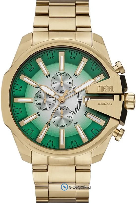 Model DZ4684 marki Diesel to stylowy zegarek naręczny męski, który posiada ciekawe rozwiązania oraz funkcje. Niebanalną konstrukcję czasomierza osiągnięto dzięki tarczy w kolorze zielonym. Pokazana metodą analogową aktualna godzina jest czytelna i łatwa do sprawdzenia. Koperta w barwach koloru złotego szeroka jest na 50 mm oraz ma grubość 10 mm - posiada okrągły kształt.