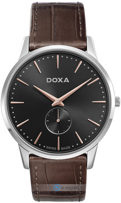Męski zegarek Doxa 105.10.101R.02 to zegarek, który dzięki swemu wzornictwu zawsze będzie prezentował się dobrze. Cyferblat zegarka jest w kolorze czarnym. Aktualna godzina zaprezentowana jest w sposób analogowy co niezmiernie łatwo pozwala ją odczytać. Koperta została pokryta kolorem srebrnym szeroka jest na 39 mm oraz ma grubość 6 mm - w kształcie okrągłym.