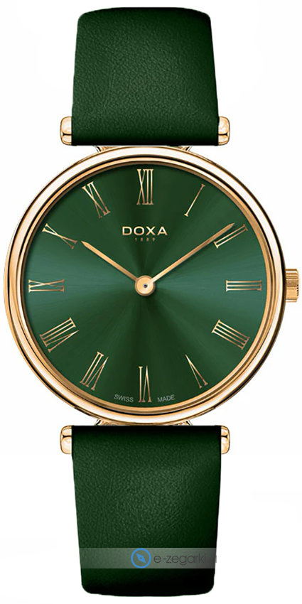 Zegarek męski 112.90.134.83 marki Doxa to stylowe połączenie funkcjonalności i modnego designu. Nieschematyczny wygląd zegarka uzyskano także dzięki tarczy w kolorze zielonym. Aktualna godzina pokazywana jest w sposób analogowy co intuicyjnie pozwala ją odczytać. Koperta w barwach koloru różowo złotego szeroka jest na 40 mm oraz ma grubość 7 mm - w kształcie okrągłym.