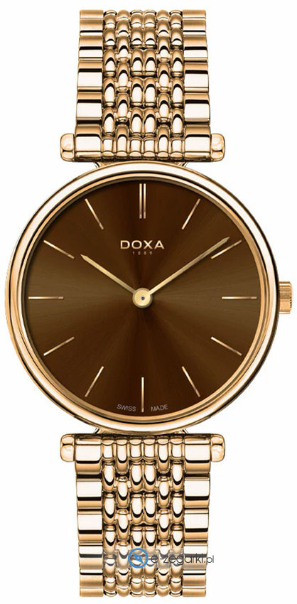 Model 112.90.321.17 marki Doxa to elegancki zegarek naręczny męski, który wyposażono w pomysłowe rozwiązania oraz funkcje. Niestereotypowy wygląd zegarka uzyskano m.in. poprzez cyferblat w kolorze brązowym. Pokazana metodą analogową aktualna godzina jest czytelna i prosta do sprawdzenia. Koperta jest pokryta kolorem różowo złotym szeroka jest na 40 mm oraz ma grubość 7 mm - ma okrągły kształt.