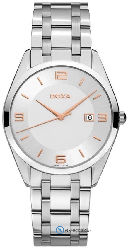 Męski zegarek Doxa 121.10.023R.10 to zegarek, który dzięki swemu wzornictwu zawsze będzie prezentował się dobrze. Styl zapewnia wysokiej klasy tarcza w kolorze białym. Aktualna godzina zaprezentowana jest w sposób analogowy co niezmiernie łatwo pozwala ją odczytać. Koperta jest ozdobiona kolorem srebrnym szeroka jest na 38 mm oraz ma grubość 8 mm - ma okrągły kształt.