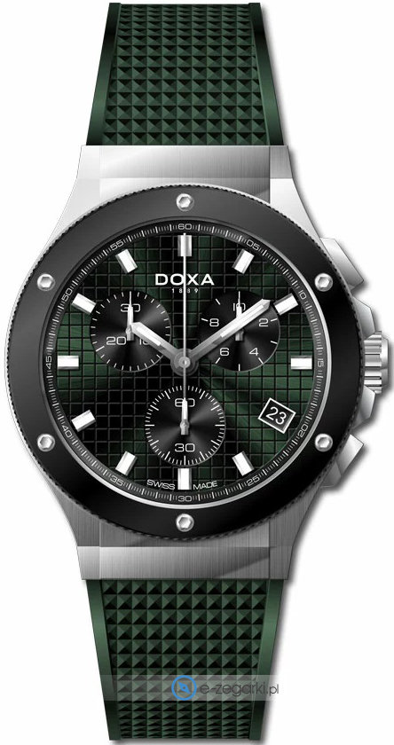 Męski zegarek Doxa 166.10.131.26 to zegarek, który dzięki swemu wzornictwu zawsze będzie prezentował się dobrze. Niebanalny wygląd czasomierza uzyskano m.in. poprzez cyferblat w kolorze zielonym. Aktualna godzina przedstawiona jest w sposób analogowy co niezmiernie łatwo pozwala ją odczytać. Koperta jest w kolorze srebrnym szeroka jest na 43 mm oraz ma grubość 43 mm - w kształcie okrągłym.