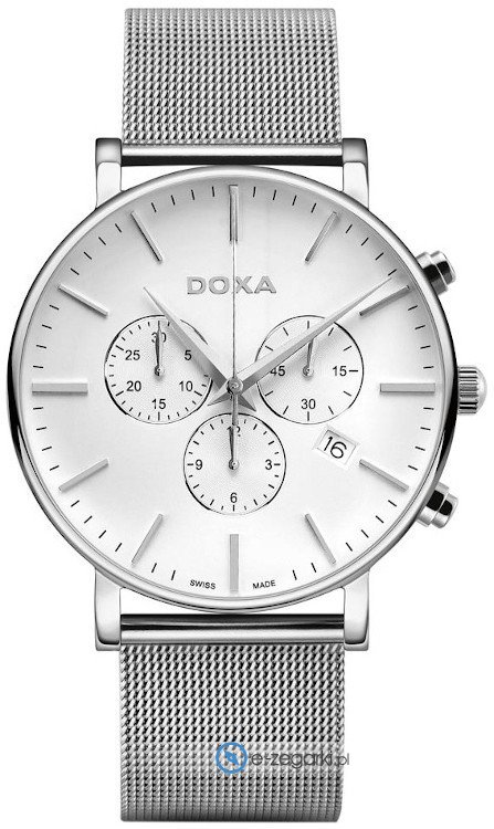 Męski zegarek Doxa 172.10.011.2.10 to zegarek, który dzięki swemu wzornictwu zawsze będzie prezentował się dobrze. Wysokiej jakości cyferblat zegarka ozdobiono białym kolorem. Godzina prezentowana jest w sposób analogowy co bez trudu pozwala ją odczytać. Koperta jest ozdobiona kolorem srebrnym szeroka jest na 42 mm oraz ma grubość 10 mm - w kształcie okrągłym.