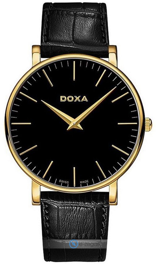 Zegarek męski 173.30.101.01 marki Doxa to dobre połączenie funkcjonalności a także modnego wzornictwa. Niebanalny wygląd czasomierza uzyskano m.in. poprzez tarczę w kolorze czarnym. Aktualna godzina przedstawiona jest w sposób analogowy co bez trudu pozwala ją odczytać. Koperta w odcieniach koloru złotego szeroka jest na 41 mm oraz ma grubość 8 mm - posiada okrągły kształt.