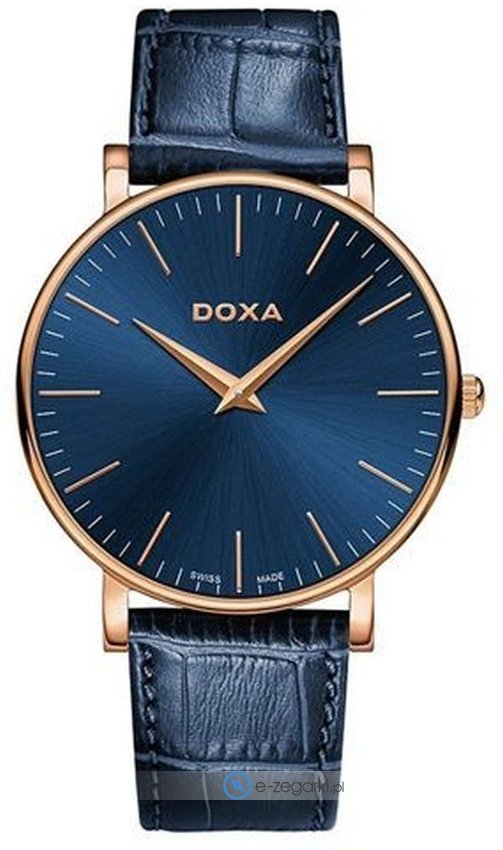 Zegarek męski 173.90.201.03 marki Doxa to dobra pozycja dla ludzi ceniących sobie dbałość o detale a także bezawaryjne zachowanie mechanizmów. Cyferblat zegarka jest w kolorze niebieskim. Aktualna godzina pokazywana jest w sposób analogowy co intuicyjnie pozwala ją odczytać. Koperta w odcieniach koloru różowo złotego szeroka jest na 41 mm oraz ma grubość 8 mm - wyróżnia się okrągłym kształtem.
