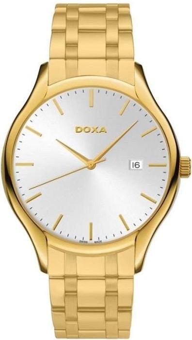 Męski zegarek Doxa 215.30.021.11 to zegarek, który dzięki swemu wzornictwu zawsze będzie prezentował się dobrze. Charakterystyczną stylistykę czasomierza uzyskano dzięki tarczy w kolorze srebrnym. Zegarek ten pokazuje godzinę w formacie analogowym dzięki temu odczyt jest bezproblemowy. Koperta w barwach koloru złotego szeroka jest na 42 mm oraz ma grubość 8 mm - cechuje się okrągłym kształtem.