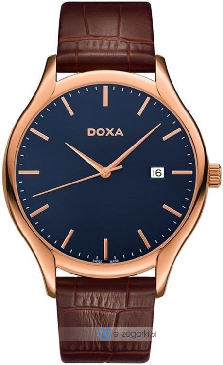 Model 215.90.201.02 marki Doxa to elegancki zegarek naręczny męski, który posiada pomysłowe rozwiązania i funkcje. Cyferblat zegarka jest w kolorze niebieskim. Aktualna godzina zaprezentowana jest w sposób analogowy co niezmiernie łatwo pozwala ją odczytać. Koperta w odcieniach koloru różowo złotego szeroka jest na 42 mm oraz ma grubość 8 mm - w kształcie okrągłym.