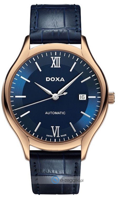 Zegarek męski 216.90.202.03 marki Doxa to dobra pozycja dla ludzi ceniących sobie dbałość o szczegóły oraz bezproblemowe zachowanie mechanizmów. Wysokiej trwałości tarczę zegarka pokryto niebieskim kolorem. Pokazana metodą analogową aktualna godzina jest czytelna i prosta do sprawdzenia. Koperta w odcieniach koloru różowo złotego szeroka jest na 42 mm oraz ma grubość 10 mm - posiada okrągły kształt.