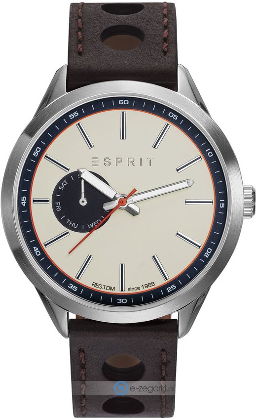 Zegarek męski ES109211001 marki Esprit to dobre połączenie funkcjonalności a także modnego designu. Atrakcyjną budowę zegarka osiągnięto dzięki tarczy w kolorze jasnym. Koperta szeroka jest na 43 mm - w kształcie okrągłym.