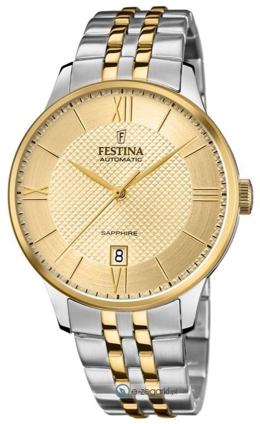 Zegarek męski F20483-1 marki Festina to idealne połączenie funkcjonalności oraz ciekawego wzornictwa. Model ten w gamie pozostałych zegarków tego producenta występuje w kolekcji Festina Automatic. Charakterystyczną stylistykę czasomierza uzyskano dzięki tarczy w kolorze złotym. Aktualna godzina zaprezentowana jest w sposób analogowy co bez trudu pozwala ją odczytać. Koperta szeroka jest na 41 mm oraz ma grubość 12 mm - posiada okrągły kształt.