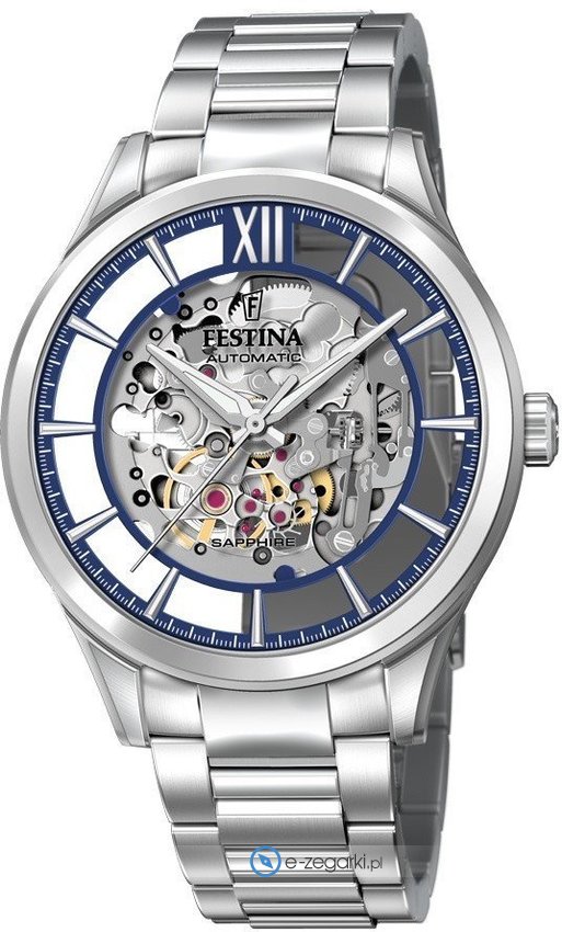 Zegarek męski F20630-3 marki Festina to stylowe połączenie funkcjonalności i modnego designu. Model ten pochodzi z serii Festina Automatic. Tarcza zegarka jest w kolorze srebrnym. Pokazana metodą analogową aktualna godzina jest czytelna i łatwa do sprawdzenia. Koperta jest w kolorze srebrnym szeroka jest na 43 mm oraz ma grubość 12 mm - ma okrągły kształt.