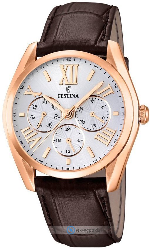Zegarek F16754-1 marki Festina to stylowy zegarek naręczny męski, który posiada pomysłowe rozwiązania i funkcje. Model ten zalicza się do kolekcji Festina Boyfriend. Ciekawy wygląd czasomierza osiągnięto m.in. poprzez cyferblat w kolorze srebrnym. Aktualna godzina przedstawiona jest w sposób analogowy co intuicyjnie pozwala ją odczytać. Koperta jest pokryta kolorem różowo złotym szeroka jest na 42 mm oraz ma grubość 10 mm - wyróżnia się okrągłym kształtem.