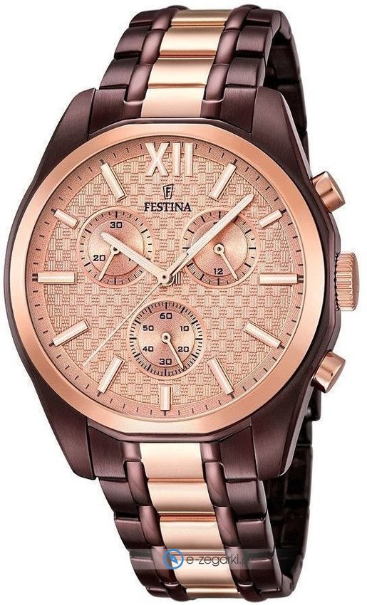 Festina tego brandu zapewne nie ma potrzeby specjalnie przedstawiać. To znana i doceniana w zasadzie na całym świecie marka zajmująca się produkcją zegarków, która narodziła się na początku XX wieku w szwajcarskiej miejscowości La Chaux-de-Fonds. Od momentu gdy marka weszła w skład osobnej grupy Festina Group w latach osiemdziesiątych poprzedniego stulecia stała się bardzo zauważalna. W dzisiejszych czasach zegarki Festina można dostać w ponad 50 krajach na wszystkich kontynentach. Markę Festina bardzo często można zobaczyć na różnego rodzaju imprezach sportowych, np wyścigach kolarskich Tour de Pologne. Istotną cechą zgeraków Festina jest posiadanie specjalnie utwardzanego szkiełka mineralnego na które marka udziela osobnej 5 letniej gwarancji. Współcześnie twarzą marki jest modny i szanowany aktor Gerard Butler, można go ujrzeć w wielu reklamach właśnie z chronometrem Festina.
