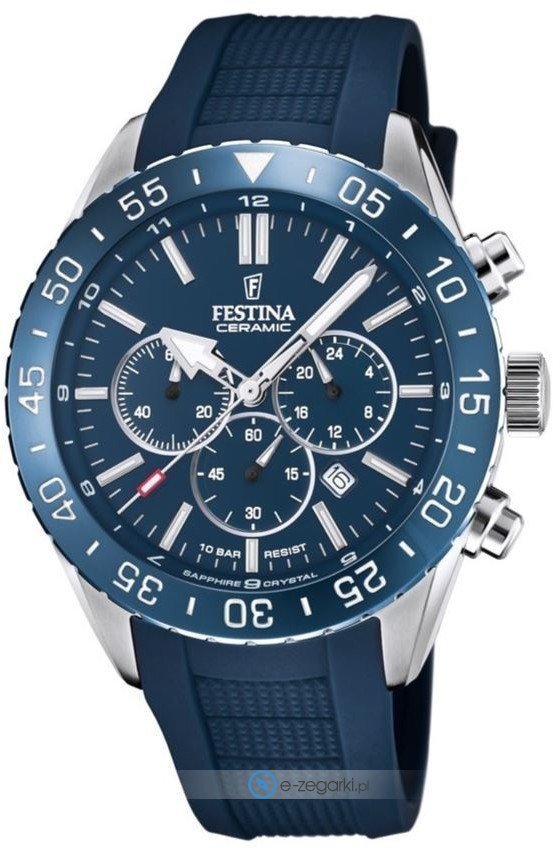 Zegarek F20515-1 marki Festina to stylowy zegarek naręczny męski, który wyposażono w ciekawe rozwiązania oraz funkcje. Model ten jest z serii Festina Ceramic. Atrakcyjny wygląd czasomierza osiągnięto również dzięki tarczy w kolorze niebieskim. Zegarek ten prezentuje aktualny czas w formacie analogowym dzięki temu odczyt jest bardzo łatwy. Koperta jest w kolorze srebrnym szeroka jest na 44 mm - posiada okrągły kształt.