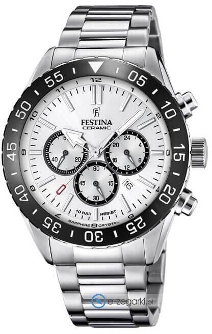 Zegarek męski F20575-1 marki Festina to stylowe połączenie funkcjonalności a także modnego wzornictwa. Model ten należy do serii Festina Ceramic. Wysokiej trwałości cyferblat zegarka ozdobiono białym kolorem. Zegarek ten prezentuje godzinę w formacie analogowym dzięki czemu odczyt jest bezproblemowy. Koperta w odcieniach koloru srebrnego szeroka jest na 44 mm - posiada okrągły kształt.
