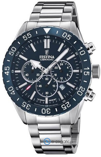 Męski zegarek F20575-2 z serii Festina Ceramic marki Festina to połączenie smaku i oryginalnych funkcji. Niebanalny wygląd czasomierza uzyskano m.in. poprzez tarczę w kolorze niebieskim. Pokazana metodą analogową bieżąca godzina jest czytelna i szybka do odczytania. Koperta szeroka jest na 44 mm - ma okrągły kształt.