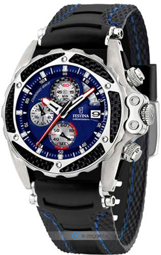 Zegarek męski F16272-5 marki Festina z rodziny Festina Chrono Bike. Styl zapewnia wysokiej klasy cyferblat w kolorze niebieskim. Zaprezentowana metodą analogową bieżąca godzina jest czytelna i łatwa do odczytania.
