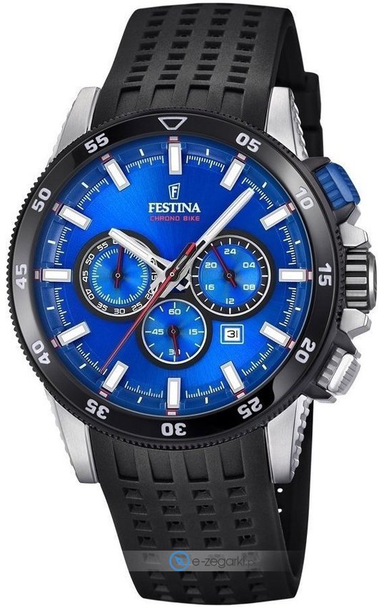 Model męski F20353-2 marki Festina z serii Festina Chrono Bike. Wysokiej trwałości cyferblat zegarka ozdobiono niebieskim kolorem. Zegarek ten prezentuje godzinę w formacie analogowym dzięki czemu odczyt jest bezproblemowy. Koperta w barwach koloru czarnego szeroka jest na 46 mm oraz ma grubość 14 mm - w kształcie okrągłym.