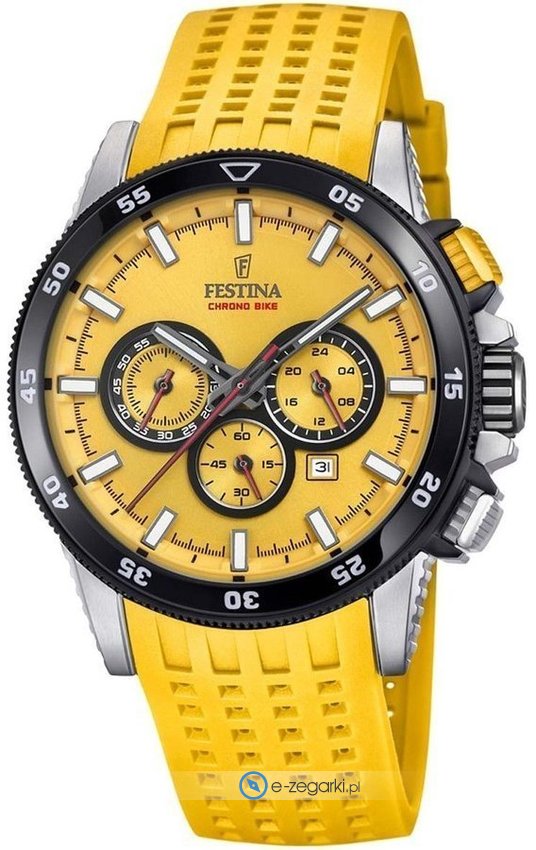Męski zegarek F20353-A z kolekcji Festina Chrono Bike marki Festina to połączenie estetyki oraz nieprzeciętnych funkcji. Wysokiej trwałości cyferblat zegarka ozdobiono żółtym kolorem. Zegarek ten pokazuje godzinę w formacie analogowym dzięki temu odczyt jest bezproblemowy. Koperta została ozdobiona kolorem czarnym szeroka jest na 43 mm oraz ma grubość 13 mm - posiada okrągły kształt.