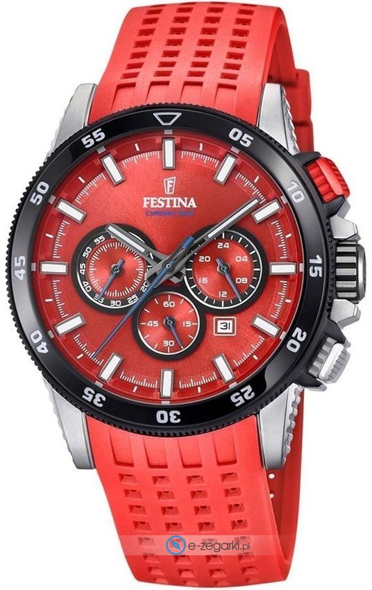Zegarek męski F20353-C marki Festina z rodziny Festina Chrono Bike. Atrakcyjną stylistykę zegarka uzyskano dzięki tarczy w kolorze czerwonym. Zegarek ten pokazuje godzinę w formacie analogowym dzięki temu odczyt jest intuicyjny. Koperta jest w kolorze czarnym szeroka jest na 43 mm oraz ma grubość 13 mm - w kształcie okrągłym.