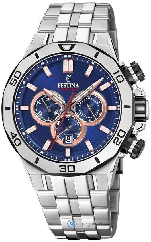 Zegarek męski F20448-1 marki Festina to stylowe połączenie funkcjonalności oraz ciekawego designu. Model ten występuje w serii Festina Chrono Bike. Atrakcyjną konstrukcję czasomierza osiągnięto z pomocą tarczy w kolorze niebieskim. Aktualna godzina pokazywana jest w sposób analogowy co niezmiernie łatwo pozwala ją odczytać. Koperta w barwach koloru srebrnego szeroka jest na 44 mm oraz ma grubość 14 mm - ma okrągły kształt.