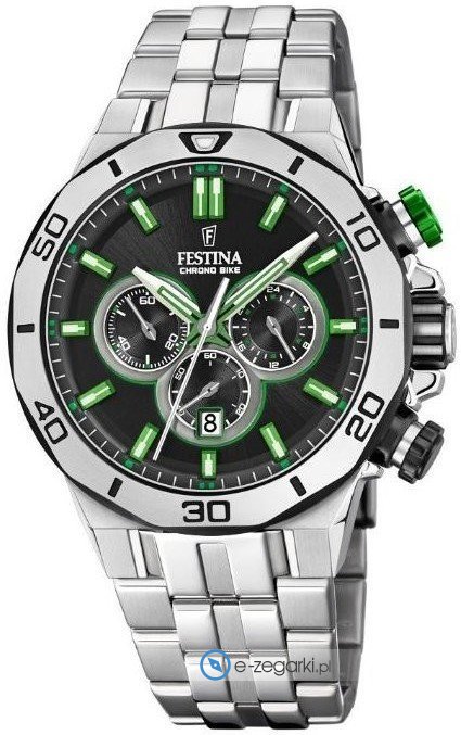 Zegarek męski F20448-6 marki Festina to dobre połączenie funkcjonalności oraz ciekawego wzornictwa. Model ten należy do serii Festina Chrono Bike. Ciekawy wygląd zegarka osiągnięto m.in. poprzez cyferblat w kolorze czarnym. Zegarek ten prezentuje aktualny czas w formacie analogowym dzięki czemu odczyt jest bezproblemowy. Koperta w barwach koloru srebrnego szeroka jest na 44 mm oraz ma grubość 14 mm - wyróżnia się okrągłym kształtem.
